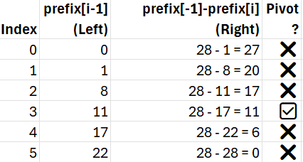 prefix = [1, 8, 11, 17, 22, 28]Step 2: Loop through all indices to find pivot