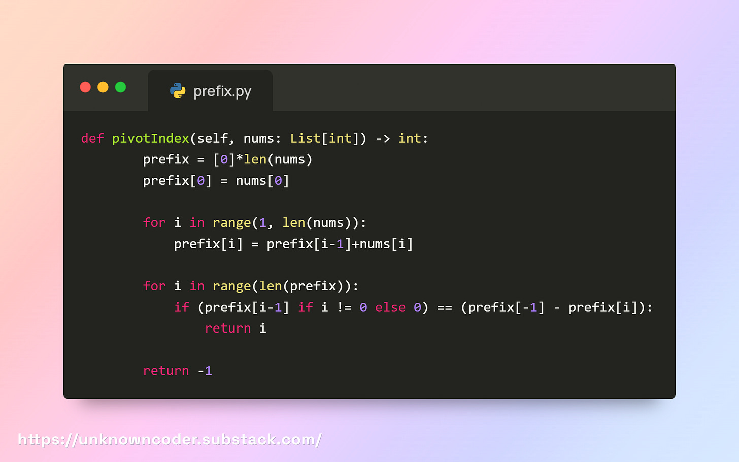 prefix[-1] - prefix[i]as everything to the rightIf they are equal → pivot found