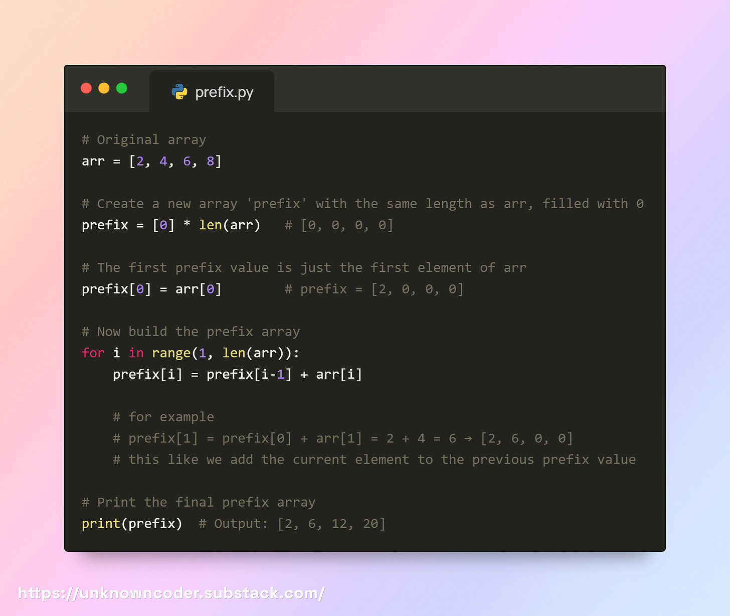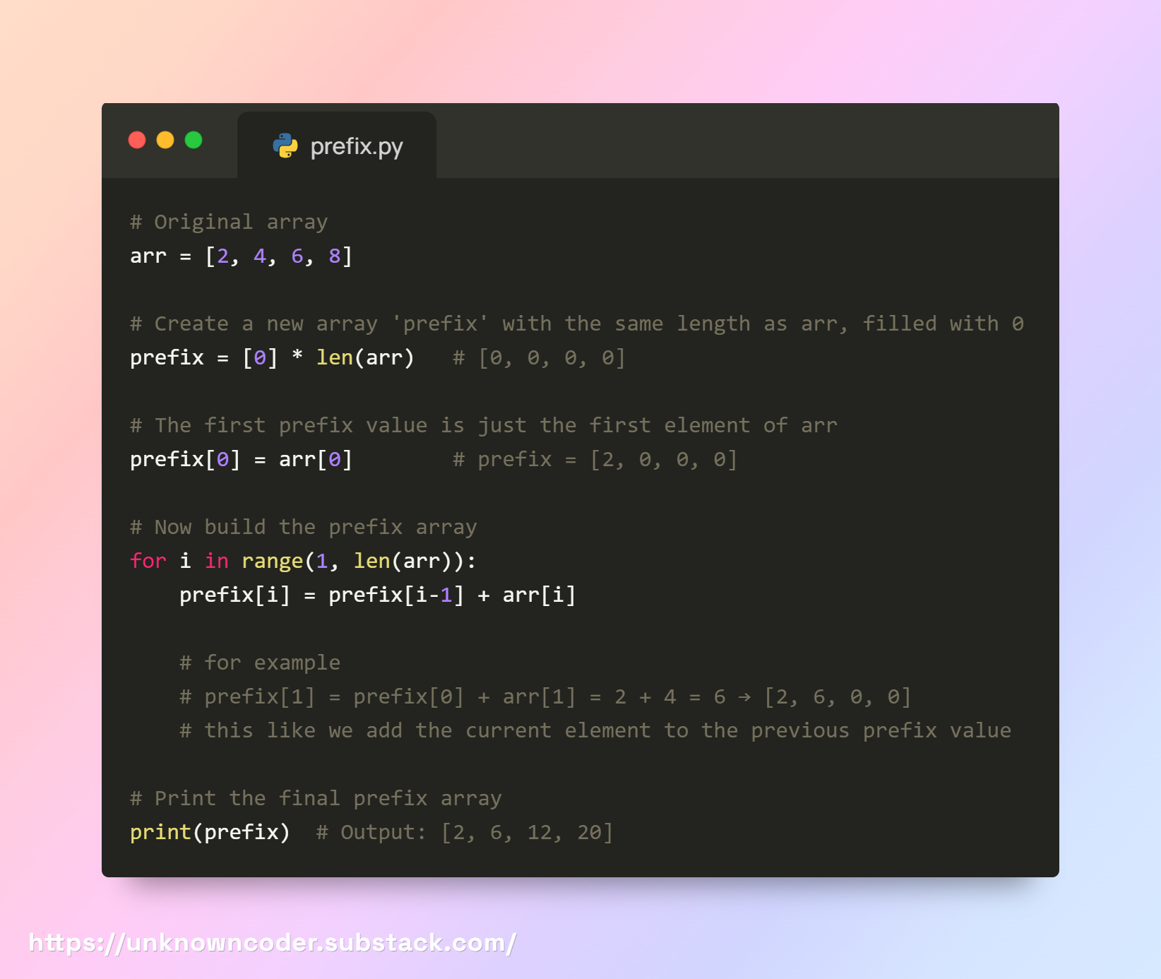 We know that a prefix is simply adding the previous value to the next value as we move forward in an array. But how do we actually implement this in code? Let’s see.